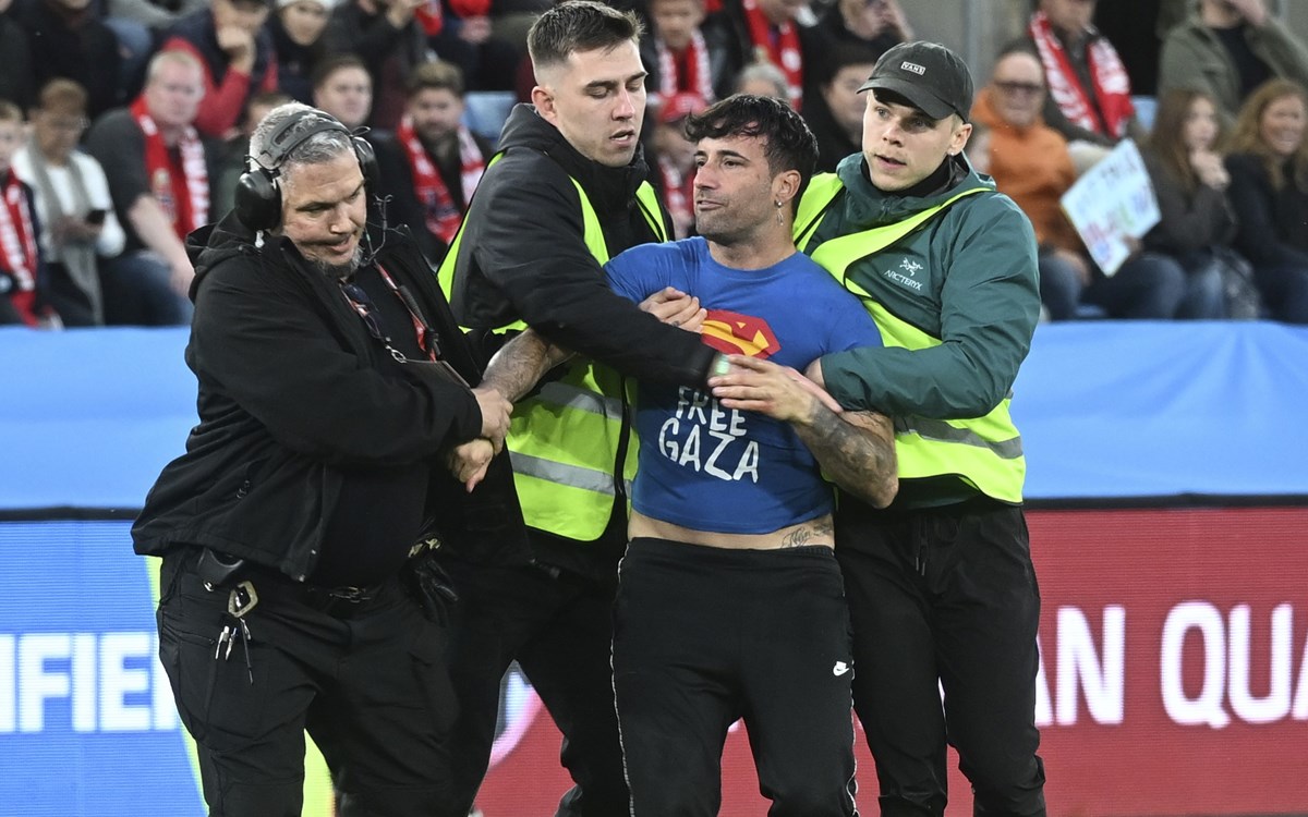 Bir futbolsever Gazze yazılı tişörtüyle sahaya atladı. Güvenlik güçleri müdahale etti.